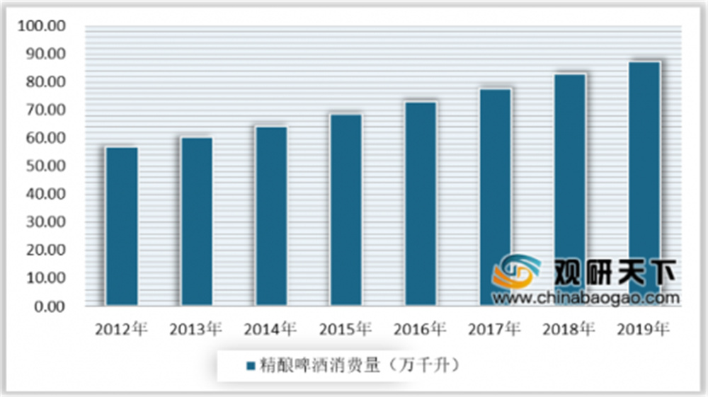 近年来中国啤酒产量持续下滑,而中高端啤酒消费则持续增长,推动了精酿啤酒市场发展。数据显示,2018年中国精酿啤酒消费量在82.9万千升左右,占啤酒消费量的2.1%,2019年中国精酿啤酒消费量为87.3万千升,约占啤酒消费量的2.4%。